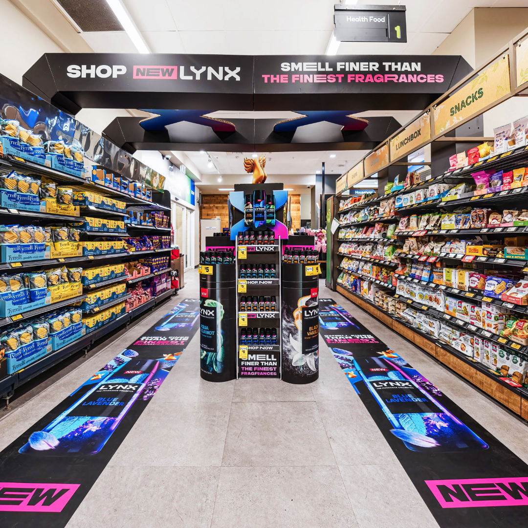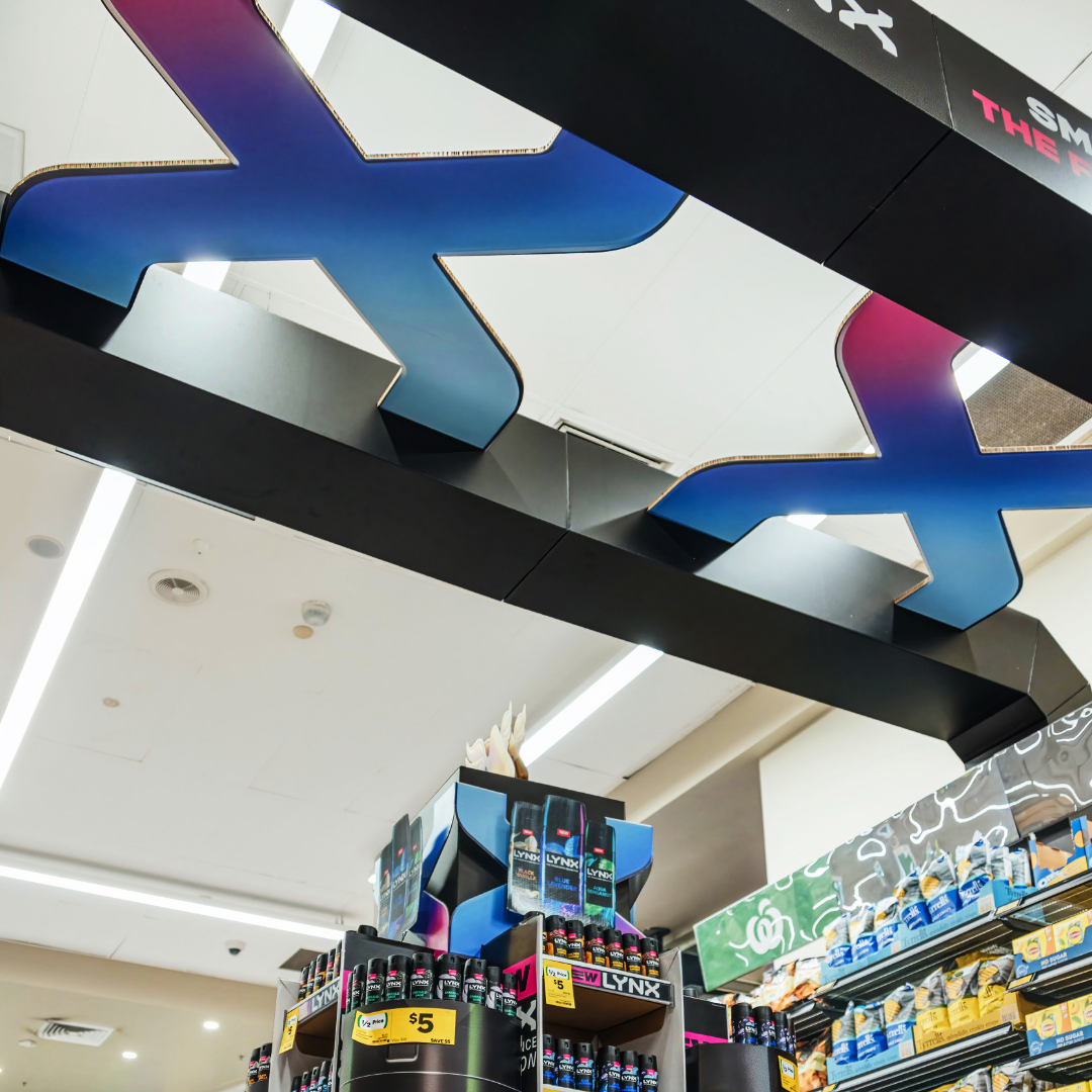 The centrepiece of the activation was an in-aisle archway, spanning 4.35 metres across the aisle—a rare and challenging feat in retail. Our design incorporated the iconic X element from the LYNX branding, placing it centrally in the archway to enhance both the visual impact and structural integrity. The archway not only served as a striking touchpoint for the LYNX takeover but also adhered to strict safety standards. A fun fact: despite its substantial presence, the structure weighed only 30 kg!